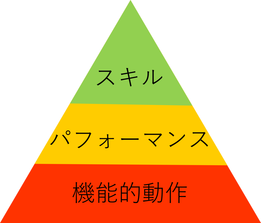 ピラミッドの頂上にあるのが、サッカーのドリブルや野球のバッティングといった「専門的なスキル」。 でも、その土台にある「自分の体を自在に操る力(機能的動作)」がグラグラだと、せっかく練習しても上達に限界がきてしまいます。