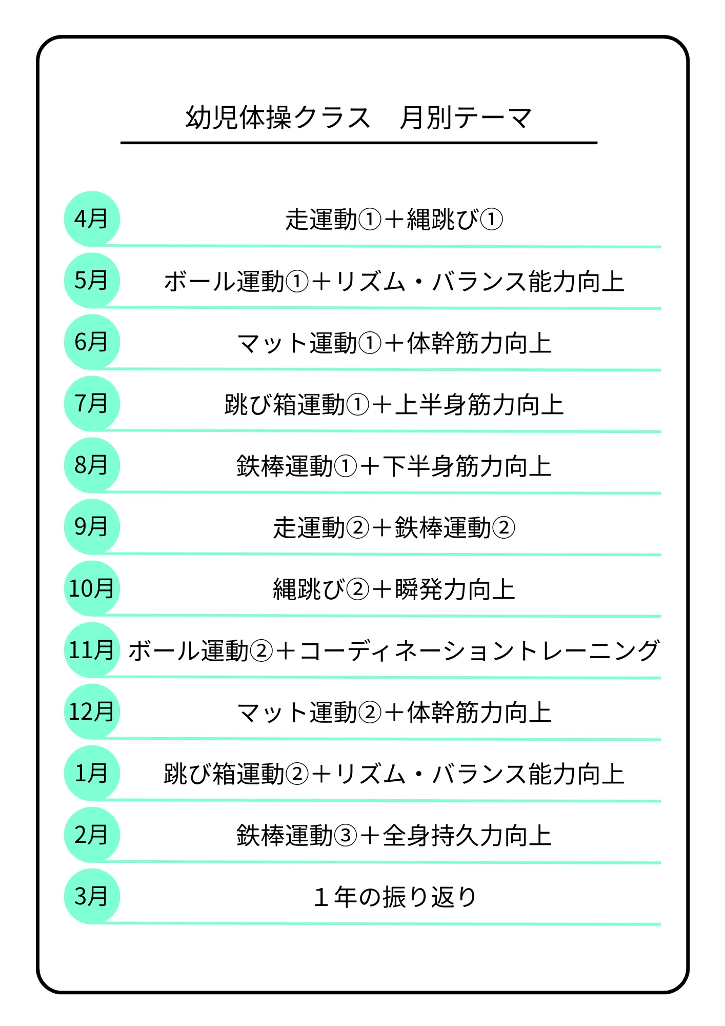 成功にこだわりすぎず、運動の「楽しさ」を存分に感じながら、運動遊びや体操種目に取り組みます。運動をスムーズに習得できる「心」と「体」の土台を形成するクラスです。