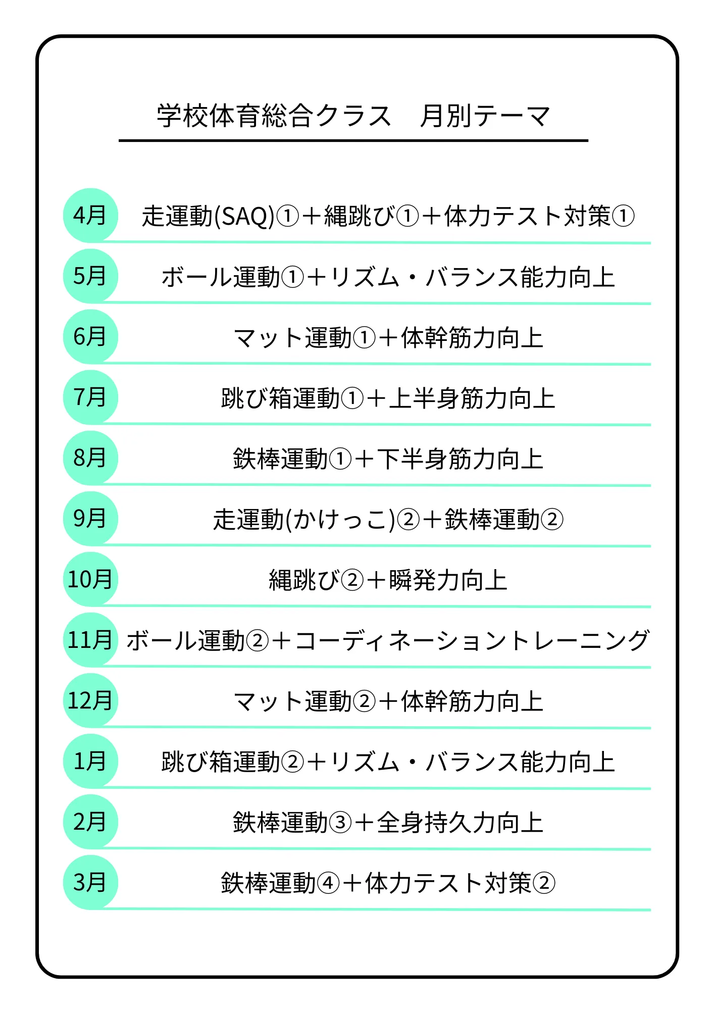 学校体育につながる基礎から応用まで、投げる・回る・跳ぶなどの動作を総合的に伸ばすクラスです。